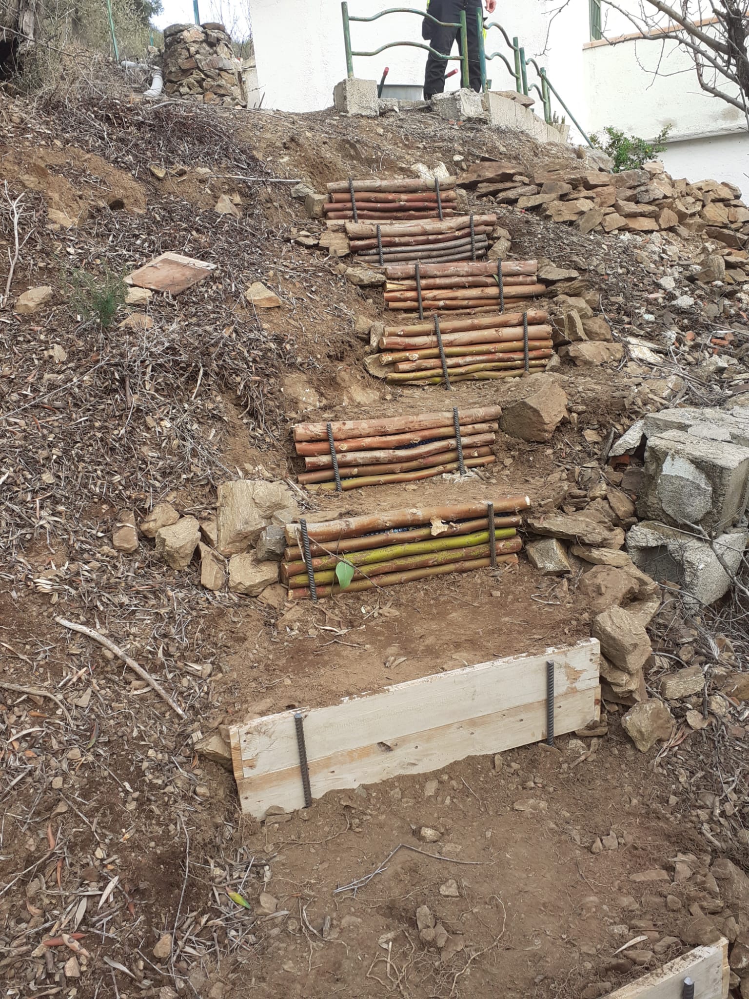 Ich wollte die Bauweise einer sog. Knüppeltreppe ausprobieren, wie ich sie von Wanderwegen in D kenne. Da wir sehr viele Eukalyptusbäume auf dem Grundstück haben, liegt ein wesentlicher Teil der Baustoffe schon vor. Der Rest: Erde und Betonstahl.